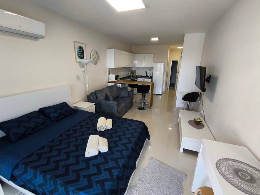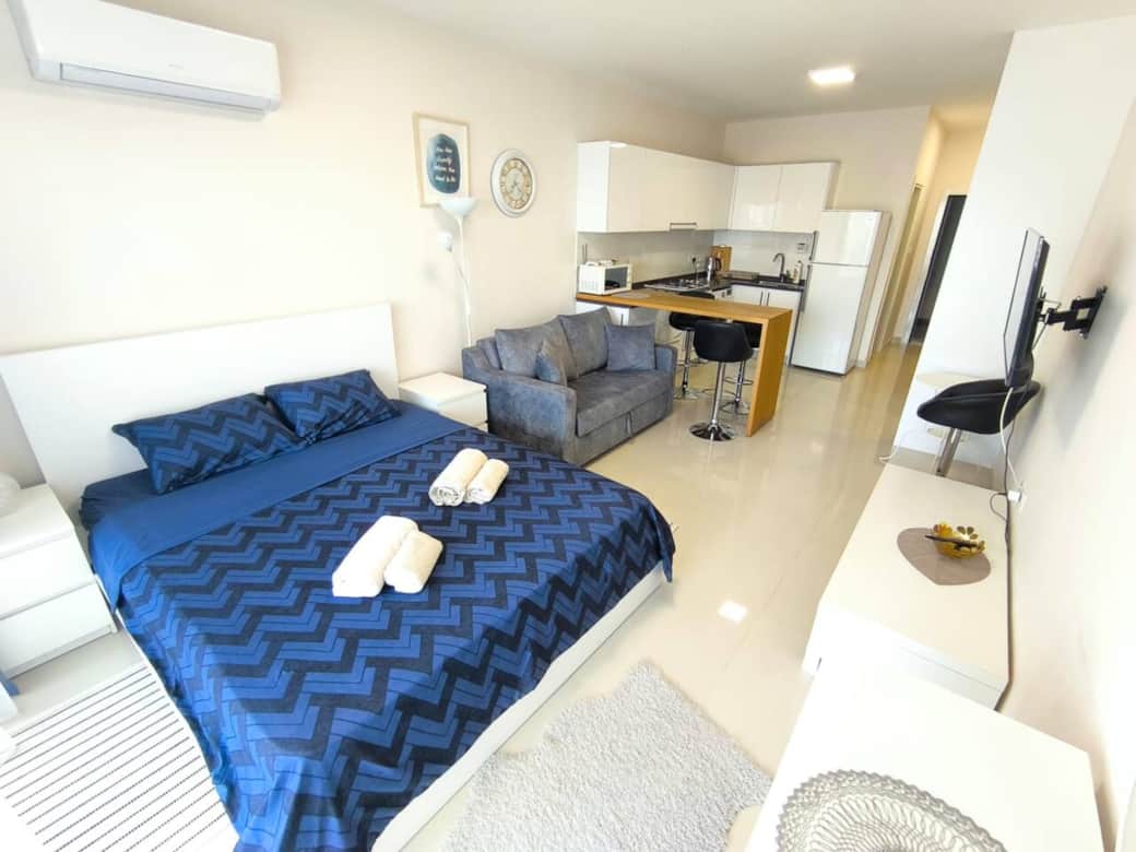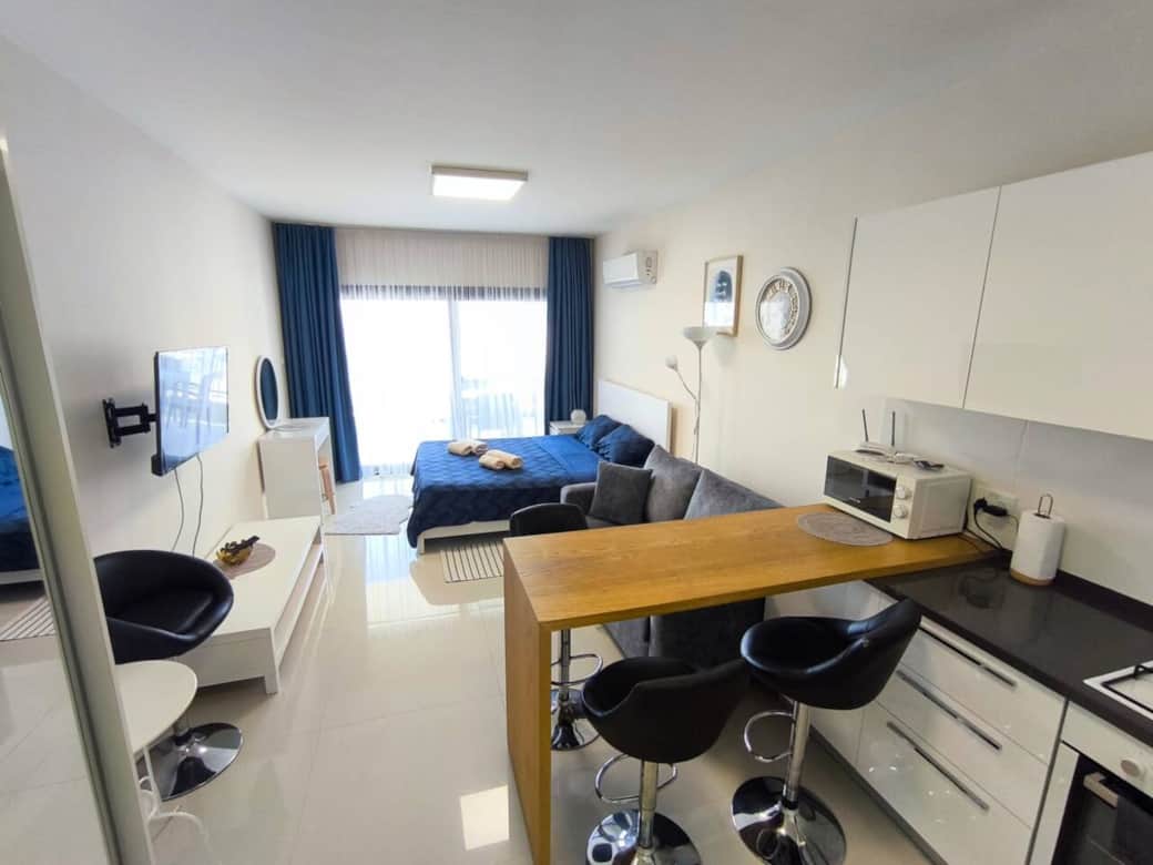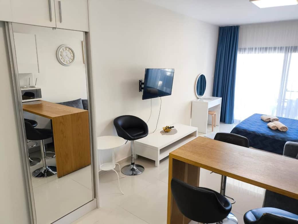 The apartment offers a comfortable double bed and a sofa bed, making it perfect for couples or families with a child. A smart TV is also available for your entertainment.Located in the popular Caesar Resort complex, guests have free access to multiple outdoor swimming pools for both adults and children, playgrounds, an indoor pool, sauna, and a fully equipped gym. On-site you will also find restaurants, cafés, and shops, everything you need for a comfortable and enjoyable stay is just steps away